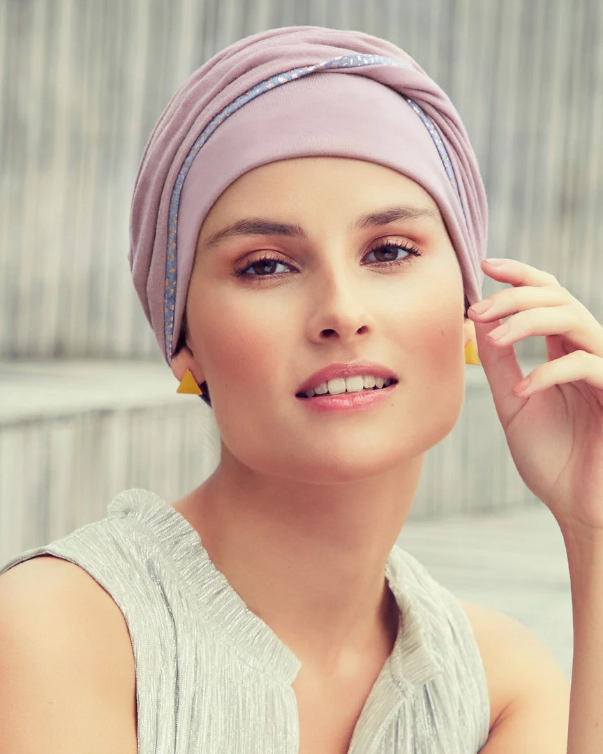 Emmy model is a 2-piece turban with detachable headband made in a beautiful striped velour with a shiny touch to give it a graceful and deluxe look. With the soft bamboo/viscose lining, you are sure to get a comfortable headwear model.