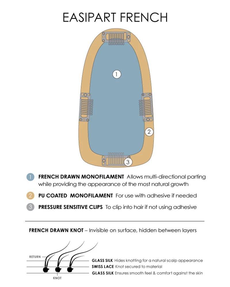 This clip in topper, worn over the part, adds volume to short styles with beautiful Remy human hair. The design is hand tied using French knotting, a superior knotting technique that creates the most natural appearance possible.