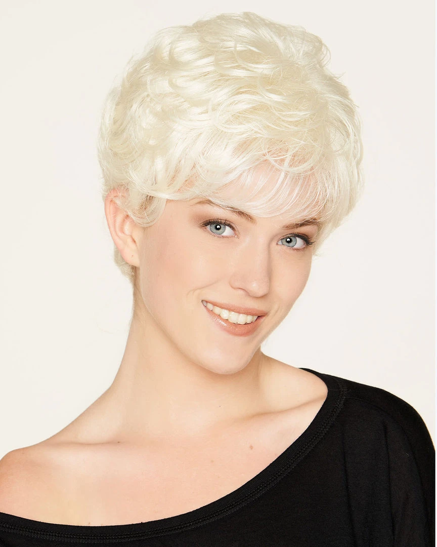 Short boy cut hair with a slight curl. Miracle wig is the perfect mix of style and convenience. The allover layers help create a natural flow, while the tapered neck delivers the coverage needed.