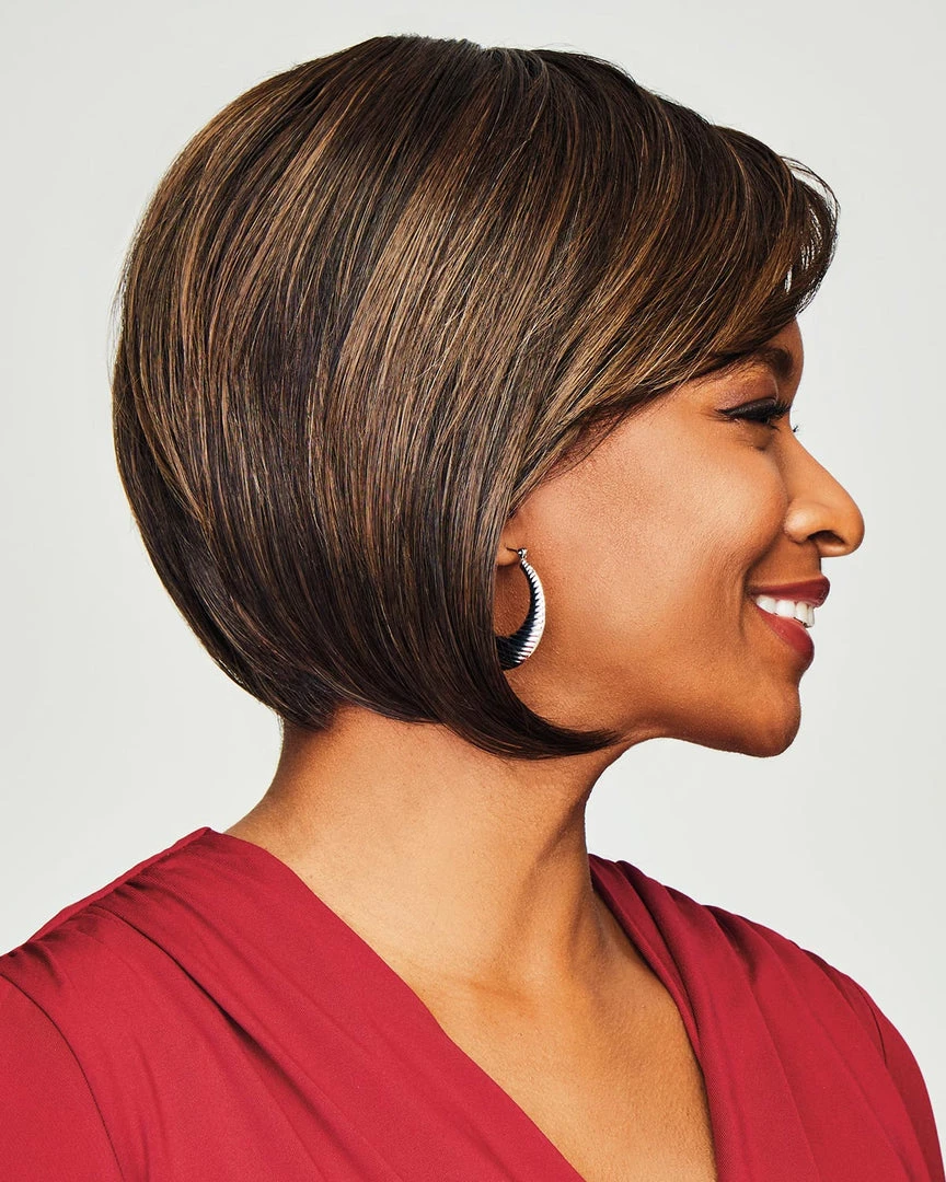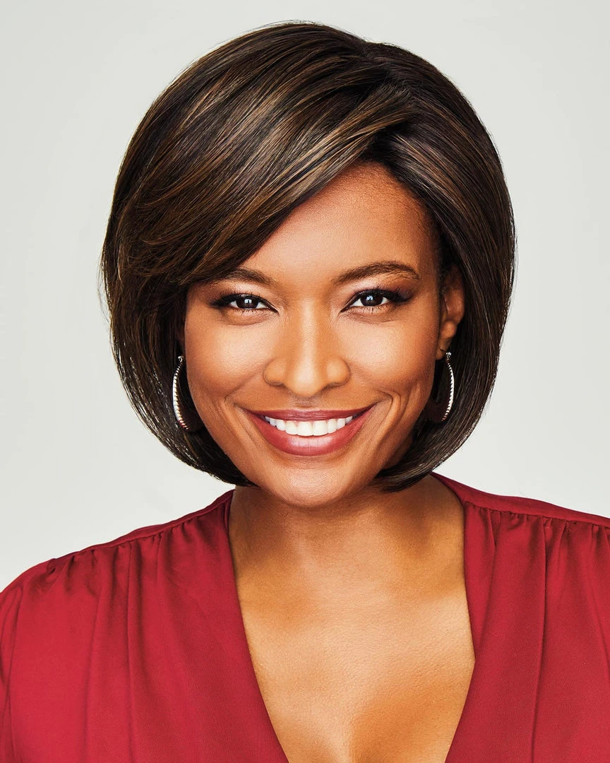 The coveted stacked bob cut is now so easy to achieve. Longer layers frame the face and jawline while the neckline is very short and tailored. With ample volume at the crown and a soft, side-swept eyelash bang, this is the sophisticated cut you’ll want to wear everywhere.