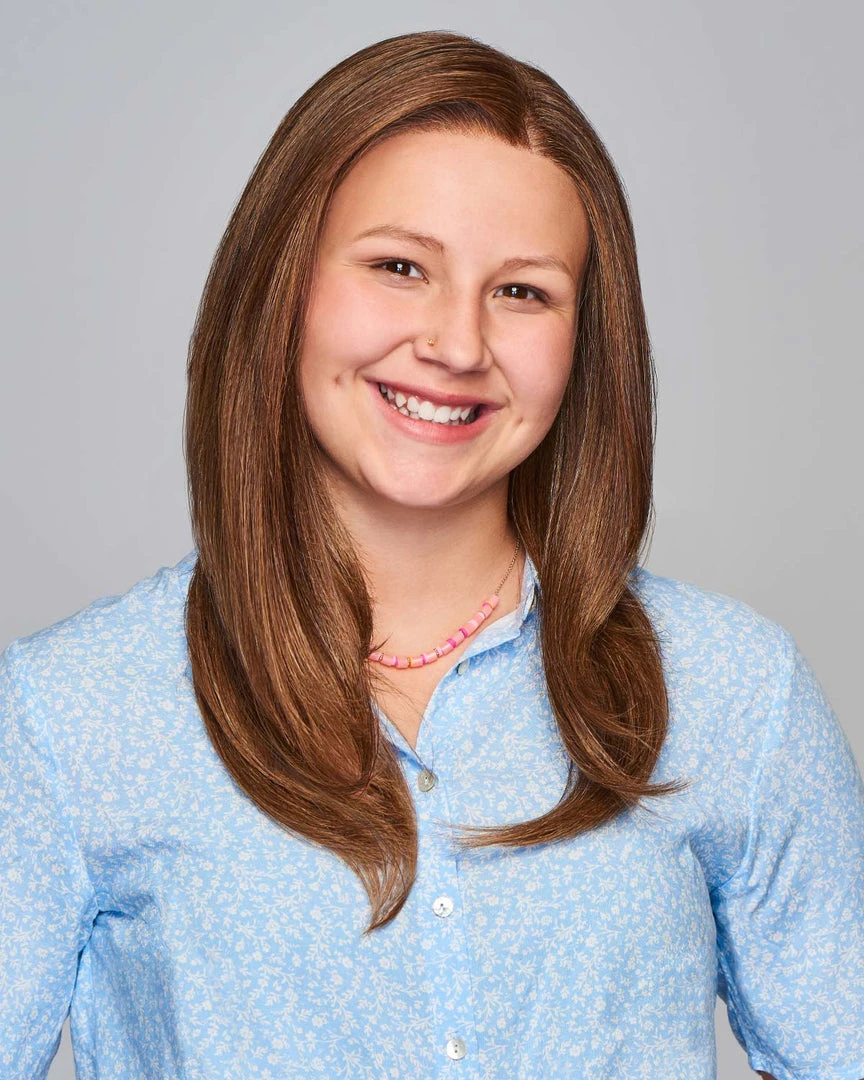 This perfectly sleek, long straight style earns top marks for its sheer lace front and natural-looking monofilament part. Classmates will never guess it’s a wig!
